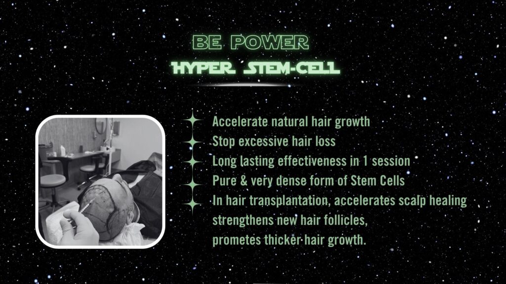 - During hair transplantation, the Hyper Stem Cell treatment accelerates scalp healing, reinforces newly developed hair follicles, and promotes thicker hair growth.